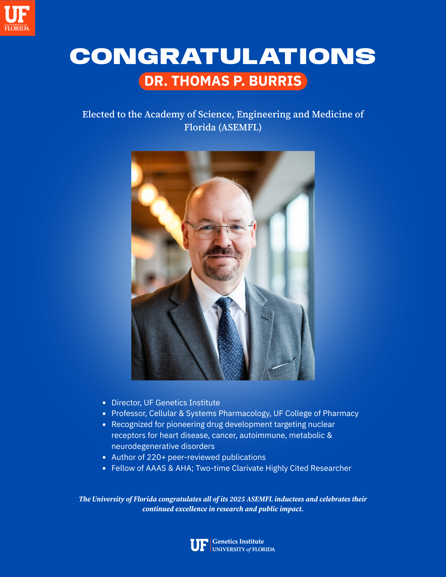 The University of Florida Genetics Institute (UFGI) is proud to announce that its Director, Dr. Thomas P. Burris, has been elected to the Academy of Science, Engineering and Medicine of Florida (ASEMFL). He joins an elite group of scholars statewide recognized for exceptional contributions to their fields and to society at large.